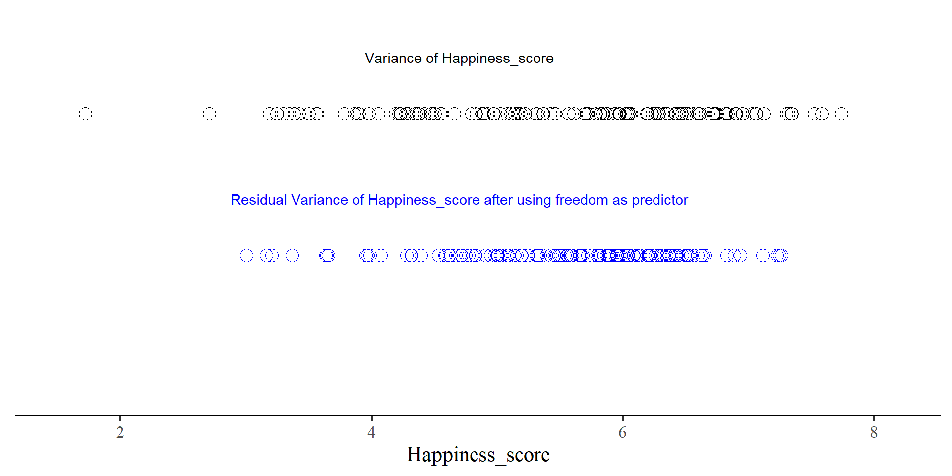 label = "Residual Variance of Happiness_score after using freedom as predictor", color = "blue") +
