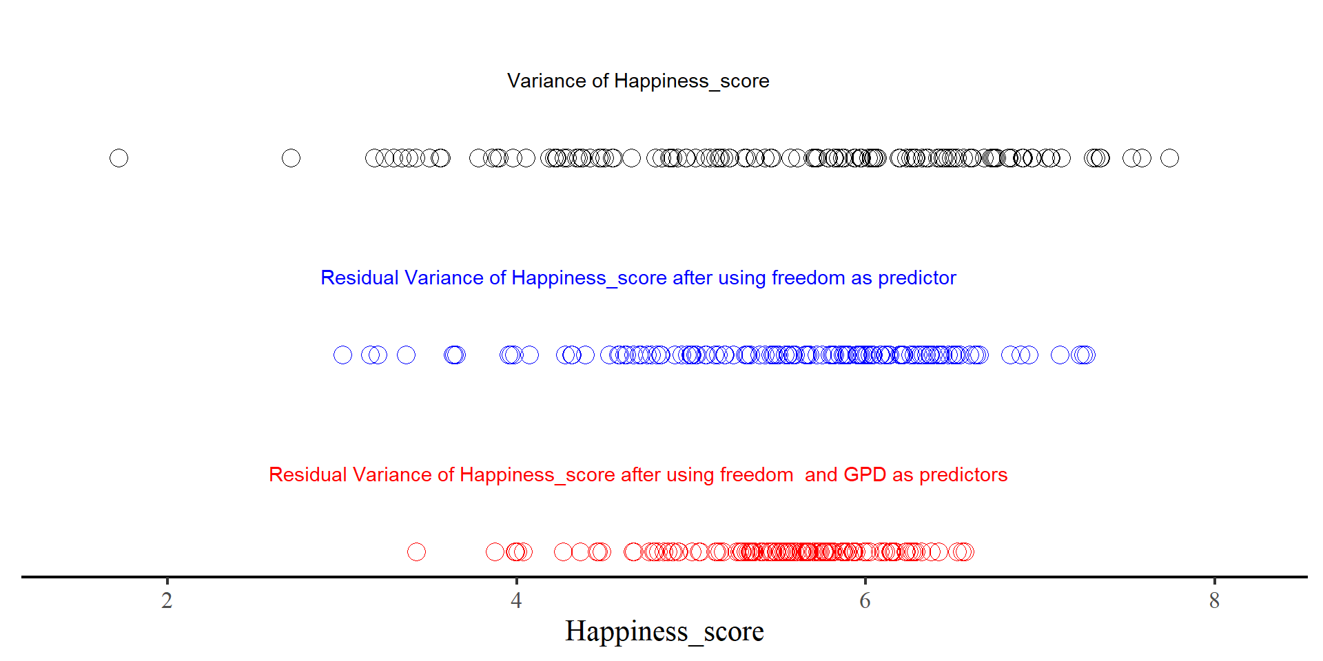 label = "Residual Variance of Happiness_score after using freedom and GPD as predictors", color = "red") +