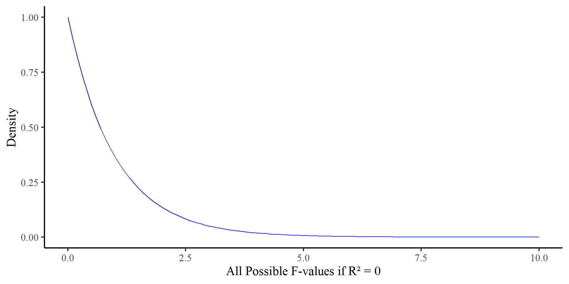 The sampling distribution for an \(F\)-statistic calculated when \(H_0\) is true and \(R^2 = 0\) is, as the name suggests, an \(F\)-distribution with \(\mathrm{df}_1 = k\), and \(\mathrm{df}_2 = \mathrm{df_{residual}}\).