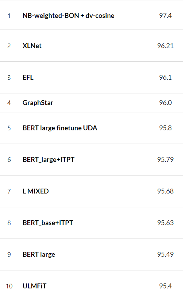 Although, this is not on par with the state-of-the-art results for models performing sentiment classification on the IMDb dataset which is as high as ~97% (refer to figure below).