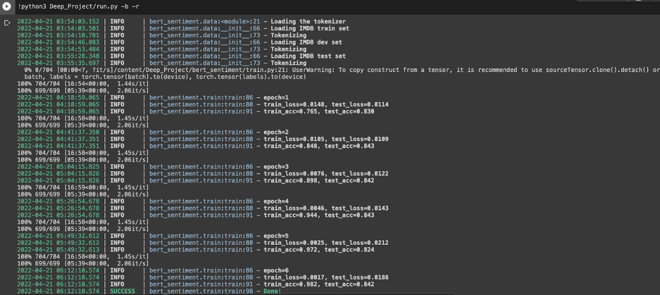 We have trained our model for 5-10 epochs on both BERT BASE and BERT LARGE which gave us some promising results reaching accuracies of ~84% on both BERT BASE and BERT LARGE.